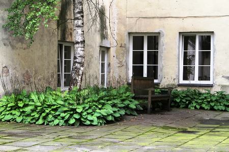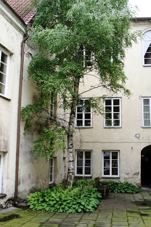 S. Daukanto kiemas. Pasakojama, kad pirmosios Lietuvos istorijos lietuvių kalba autorius Simonas Daukantas taip norėjęs mokytis Vilniaus universitete, kad į Vilnių atėjęs pėsčias iš Žemaitijos. Kiemelio viduryje augantis ąžuoliukas atkeliavo iš jo gimtojo Klevų kaimo, pasodintas universiteto 400 metų sukakties proga, tačiau pirmasis neprigijo, teko persodinti Sirvydo kieme, o Daukanto kieme sodinti antrąjį. Tačiau neprigijo ir tas, vėl perkeltas į Sirvydo kiemą, kur abu jie galbūt filologijos poveikio kiemo mikroklimate auga puikiai. Tad dabar kieme augantis ąžuolas yra jau trečiasis. Ši universiteto rūmų dalis yra daug vėlesnė už Sarbievijaus kiemo statinius, pradėjo formuotis XVIII a. pabaigoje iš universitetui dovanotų Vilniaus didikų namų. Į kiemą patenkama siauru praėjimu iš Sarbievijaus kiemo, kiemo pietinio korpuso vakarinės dalies antrąjį ir trečiąjį aukštą dengia renesansinis atikas, papuoštas dvigubomis, aukštais piliastrais paremtomis arkutėmis. Šis pastatas, manoma, statytas XVI–XVII a. sandūroje, naudotas ūkiniams reikalams. Čia buvo arklidės, stalių dirbtuvės, bravoras, o antrame aukšte – svirnai. Šis kiemo korpusas po XVIII a. pabaigos perstatymų buvo paskirtas profesorių butams. Restauruojant Filologijos fakulteto Vertimo studijų katedros patalpas, buvo atidengtas vieno buto sienas puošusios freskos fragmentas, kuriame išlikusi ir data – 1794 m.