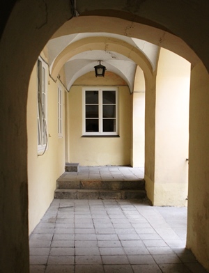 Veikiausiai seniausi yra pietiniai kiemo pastatai, juose išlikusi XVII a. struktūra, o fasadas primena didelės bažnyčios šoninį fasadą. Akademijos laikais pastato pirmame aukšte buvo atviros arklidės. Pietinis kiemo sparnas turi masyvius dviejų aukštų kontroforsus su nišomis ir praėjimą su XX a. pr. metaliniais vartais ir aukštyn kylančiais granito laiptais, kurie jungia šį kiemą su Didžiuoju. Virš praėjimo Vinco Kudirkos „Varpo“ 100 m. jubiliejinis paminklas. Šio pastato paradinė pusė, iš Didžiojo kiemo, buvo rekonstruota, o M. K. Sarbievijaus kiemo dalis išsaugojo XVI a. architektūrines formas. Rytiniame korpuse po rekonstrukcijos, skirtos 400 metų universiteto sukakčiai, įsikūrė Lituanistikos centras, knygynas „Littera“. Tuo pat metu nemažai Filologijos fakulteto skaityklų ir vestibiulių pasipuošė žymiausių lietuvių dailininkų freskomis: Rimtauto Gibavičiaus, Petro Repšio, Vytauto Valiaus. Knygyną puošia dailininko Antano Kmieliausko tapyba (1978–1979 m.), įamžinti senojo Vilniaus universiteto mokslus ir menus. Kmieliauskas tais laikais buvo valdžios nepageidaujamas menininkas ir reikėjo drąsos duoti užsakymą būtent jam. Ant skliautus rėminančių piliorių – žymiausių Vilniaus universiteto profesorių ir auklėtinių, mecenatų portretai, nutapyti remiantis išlikusiais autentiškais dokumentais: Vilniaus jėzuitų kolegijos įkūrėjo vyskupo Valerijono Protasevičiaus, astronomo rektoriaus Martyno Počobuto, dailininko Pranciškaus Smuglevičiaus, istoriko Joachimo Lelevelio, mediko Johano Franko ir kitų. Šiame pastate be Lituanistikos padalinių: Lietuvių literatūros, Lietuvių kalbos, Lituanistinių studijų, Baltistikos katedrų įsikūrusi ir Donelaičio skaityka, o požeminis praėjimas jungia su gretimo kiemo statiniu - Domus Philologus.