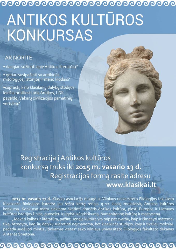 Konkurso klausimais bus tikrinamos I. Antikos literatūros, II. mitologijos, III. Antikos istorijos, IV. Antikos meno (keramika, skulptūra, architektūra) žinios. Pasiruošimo pagrindas – kompleksinės istorijos, lietuvių kalbos, dailės ir kt. pamokose įgytos žinios.
