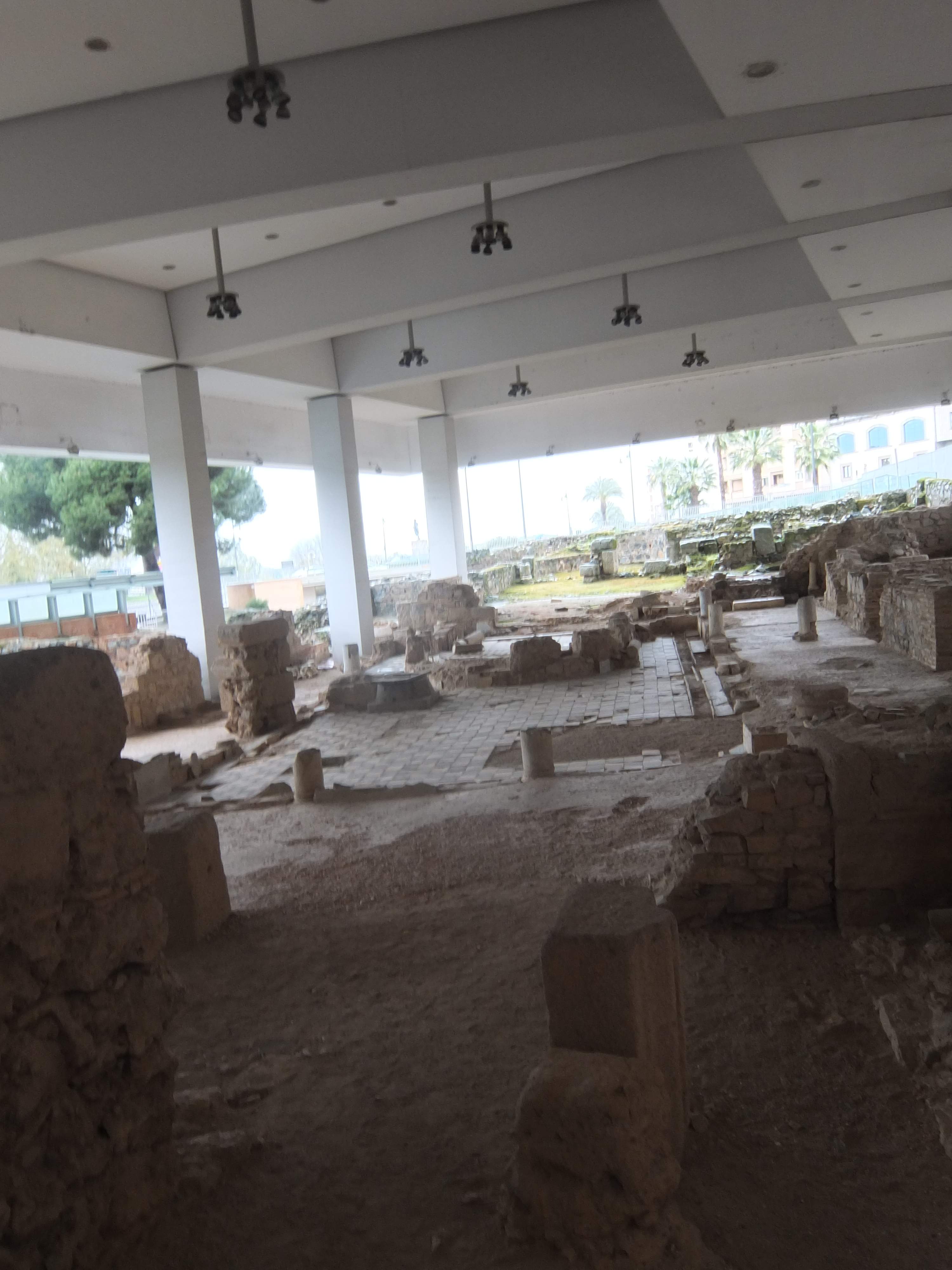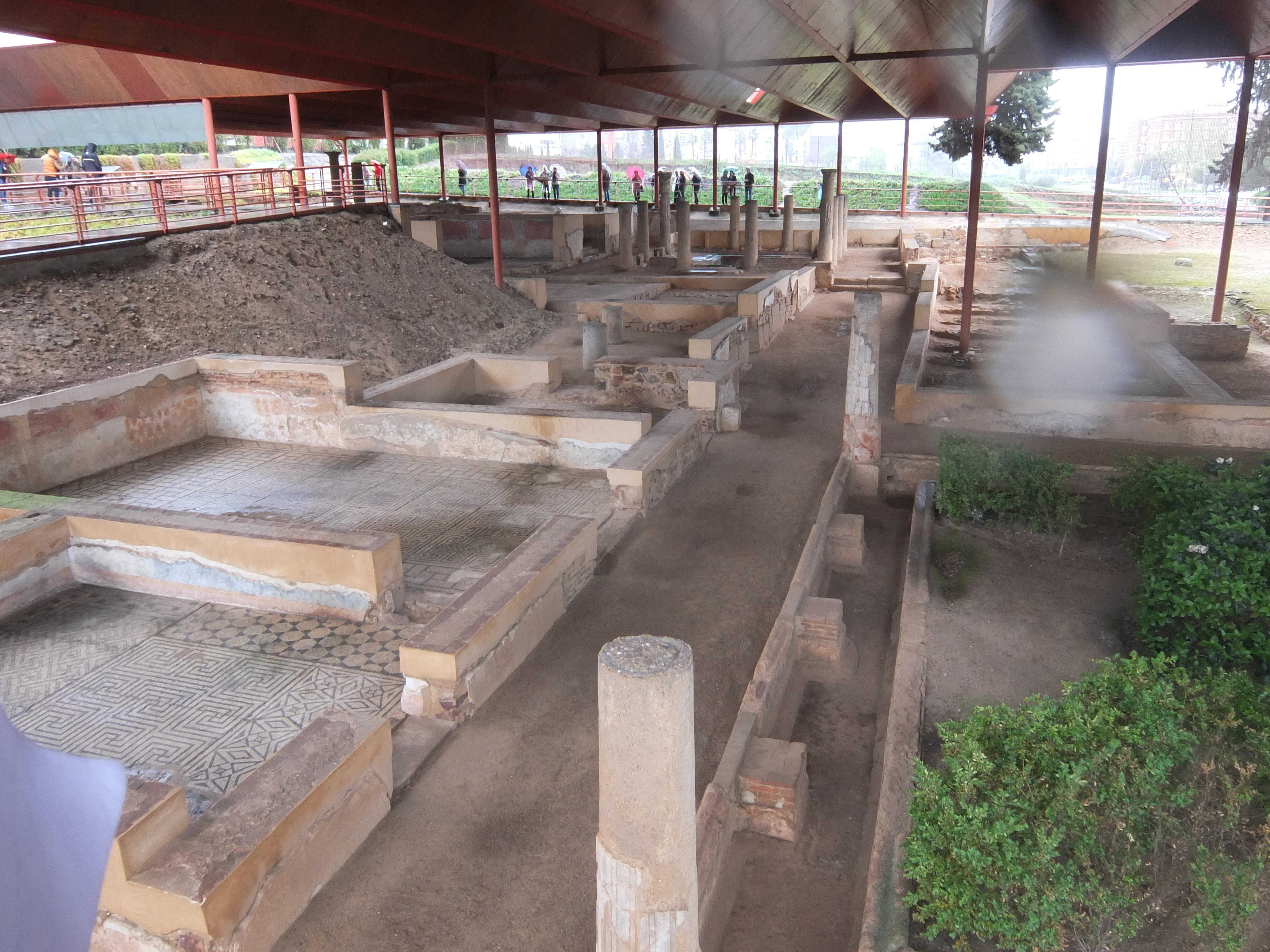 Merida, Mitrėjo namas. Statinio liekanos ir mozaikos uždengtos stogu. Deja, turistų jis neapsaugo nuo lietaus...