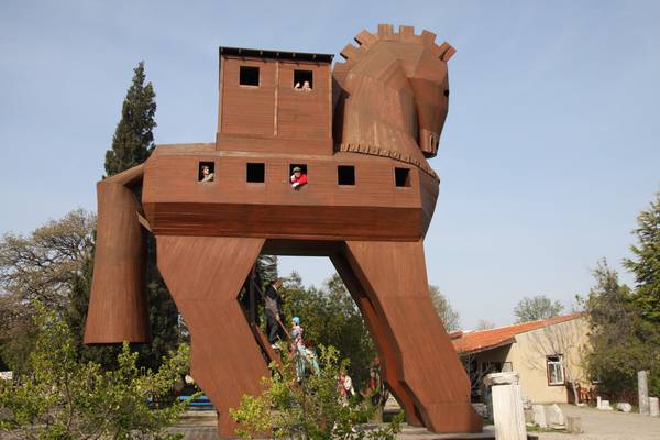 Troja. Šalia Trojos archeologinės zonos mūsų dienomis pastatytas medinis arklys. Nors, žinoma, šis Trojos arklys neturi nieko bendra su tikrais istorijos paminklais ir archeologijos radiniais, turistams jis teikia įdomią pramogą( ir ne tik vaikams).
