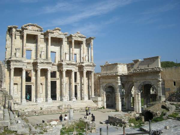 Efesas. Puikiai išlikęs ištisas antikinis miestas. Tolumoje matyti Efeso bibliotekos pastatas.