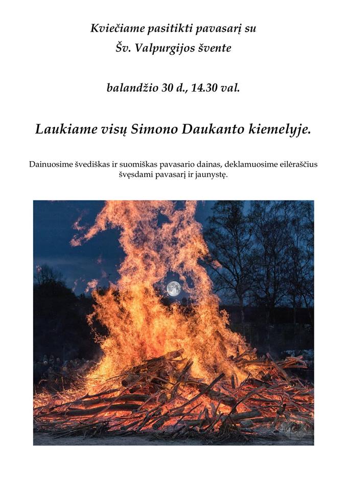 - Balandžio 30 d., trečiadienį, 14.30 kviečiame visus susitikti Simono Daukanto kieme ir džiaugsmingai – dainomis ir laužo liepsnom – išvyti žiemos likučius ir įtvirtinti pavasario atėjimą pagal švediškas Valborgo (šv. Valpurgijos) šventės tradicijas.