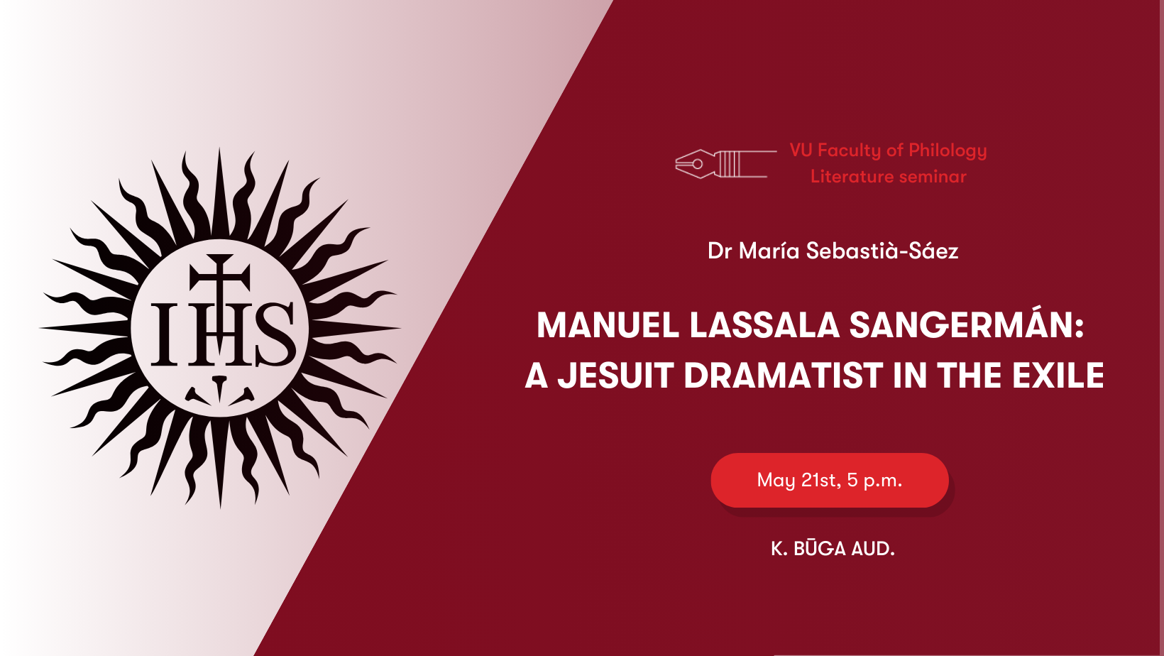 You are cordially invited to the Faculty’s Literature Seminar "Manuel Lassala Sangermán: a Jesuit dramatist in the exile", which will be held in English, and will take place on Tuesday, 21 May, at 5 pm in Kazimieras Būga Auditorium.