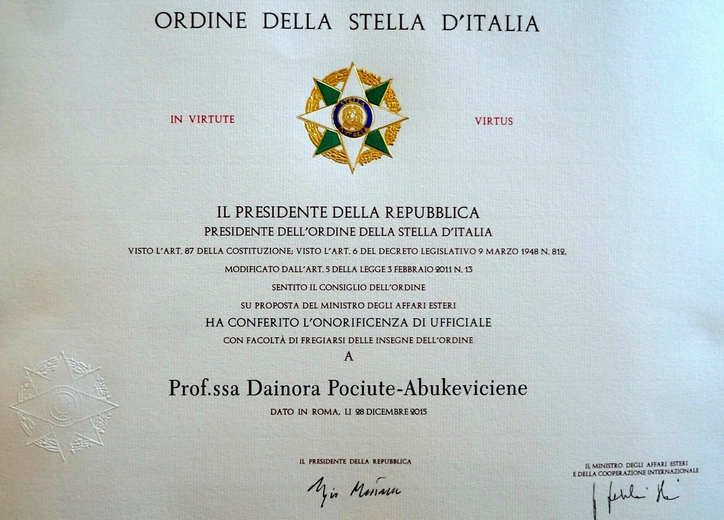 2015 m. gruodžio 28 d. Italijos Respublikos prezidentas Sergio Mattarella apdovanojo Lietuvių literatūros katedros vedėją, prof. Dainorą Pociūtę-Abukevičienę Italijos Žvaigždės antrojo laipsnio Karininko ordinu (Ordine della Stella d’Italia - Ufficiale) už akademinius nuopelus tyrinėjant Italijos ir Lietuvos Renesanso ryšius ir plėtojant mokslinį šių šalių bendradarbiavimą.